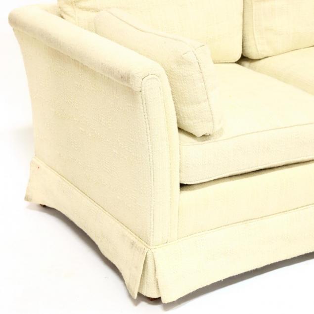 Contemporary, ivory boucle upholstery, down filled cushions, pleated skirt, labeled.