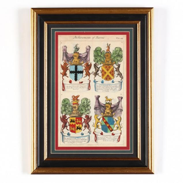 Hand-colored engravings on laid paper, likely late 17th century/18th century, presented in uniform matting and framing.
