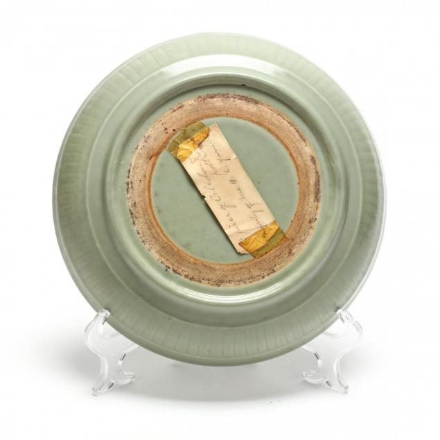 Heavily potted with incised lotus blossom pattern on center of dish, incised lines on the interior of rim and on exterior, and a smaller bowl with incised lotus blossom in center, both have unglazed ring on underside.