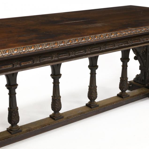 Early 20th century, walnut, rectangular top, carved molded edge, with trestle base having ornately carved acanthus leaves, rosettes and paw feet, with arched colonnade stretcher.