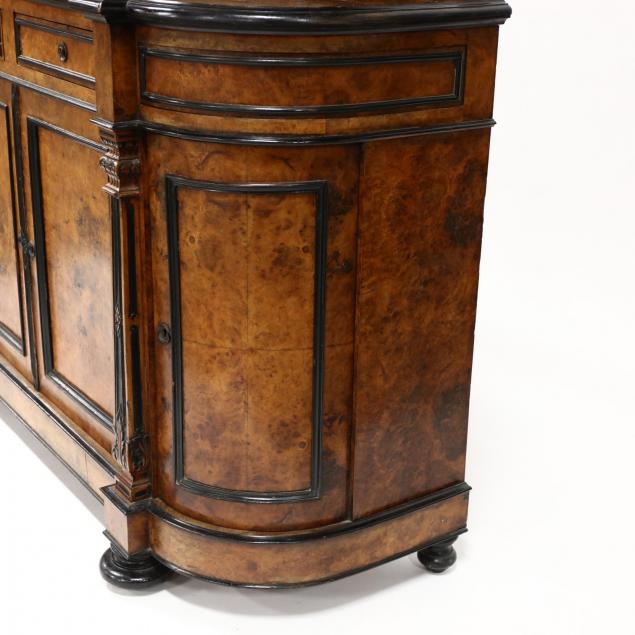 Circa 1860, choice burl wood veneers, ebonized highlights, oak secondary, three part form, backsplash featuring a central cartouche with relief carved nuts and fruit, mirrored back, base with two upper side by side drawers above two paneled cabinet doors, flanked by rounded cabinet doors, on suppressed bun feet.