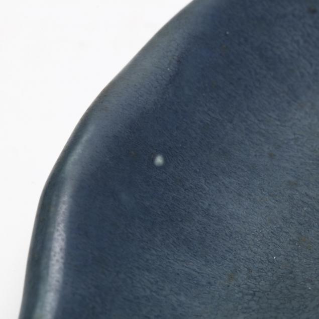 Shape 998, 1920, dark blue vellum glaze, with a large Rook standing on a lily pad, the lidded inkwell shaped like a central flower pod, with original pottery insert.