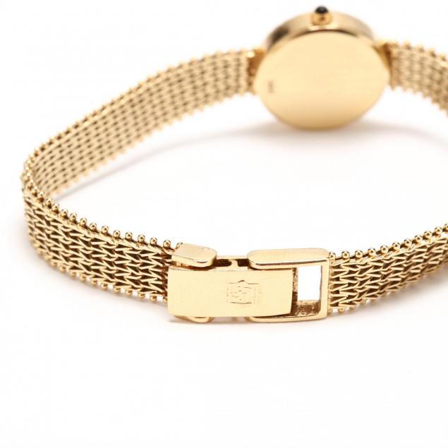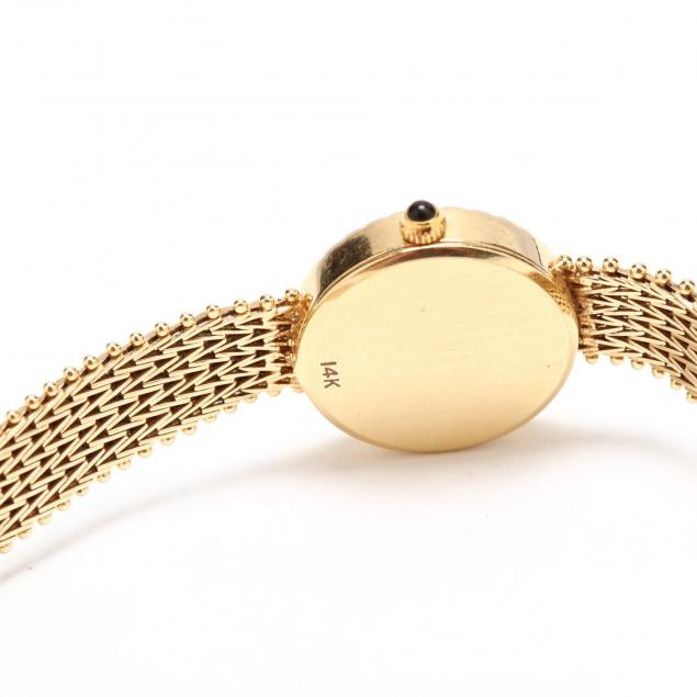 The watch with quartz movement, the signed round dial with stick hour markers, completed with a gold bracelet band, stamped 14KT IG (6.5 in.); bracelet of woven design with five geometric stations, terminating in a box clasp, stamped 14KT I.G. U.S.A. (7 in.)