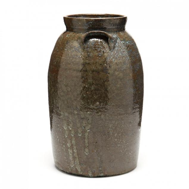 Four or five gallon size, alkaline glaze with scattered rutile, typical high collar, lug and strap handle, clay with numerous impurities, not signed.
