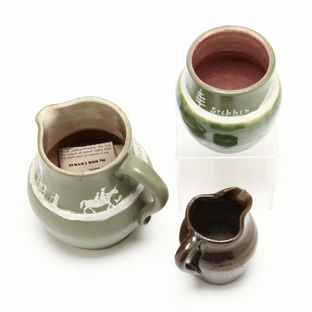 A cameo pitcher and vase, both with Westward Ho scenes and signed in slip, the pitcher dated 1951 (6 x 5 in.); the Bachelder piece is a cream jug with glyph signature (4 in.) (rim chips).