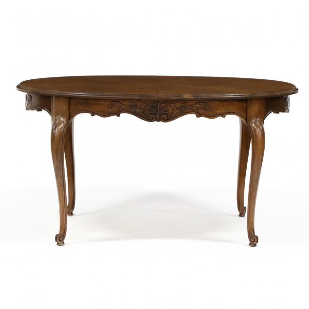 Mid 20th century, walnut, oval top with book matched veneers, carved scalloped skirt, raised on cabriole legs with whorl foot, with two leaves, labeled.