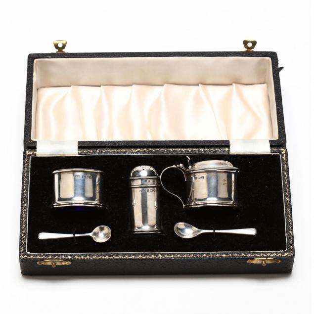 Mark of Suckling Ltd., Birmingham (1940, 1941, and 1942); the five piece set including a salt cellar, pepperette (2 in.), mustard pot, salt spoon, and mustard spoon; presented in the original fitted case.