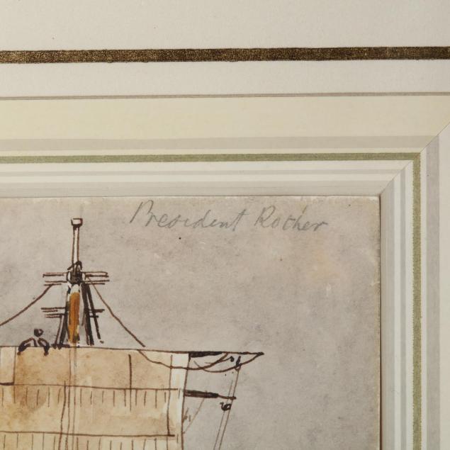 attractively matted and framed under glass, retaining a gallery label for Alice Dodge Berkeley of London (DOA 13.75 x 10.5 in.); the second a watercolor of a ship in full sail, monogrammed at lower right, matted and framed under glass (DOA 10.5 x 8.5 in.); and the third a pencil sketch by George Edwards Hering (1805-1879), retaining a label from Fry of London identifying this as a study at Arran, Scotland, matted and framed under glass (DOA 9.75 x 12.75 in.).