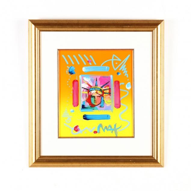 Extensive paint and collage over print on paper, artist signed in acrylic lower right, framing retains original label, matted and presented in gilt frame.