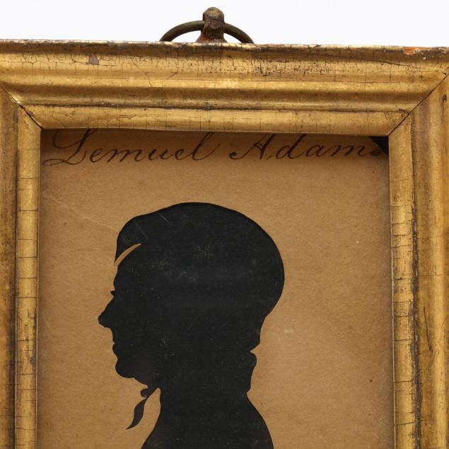Hollow cut silhouette of a gentleman identified in ink inscription as "Lemuel Adams / February 4 1828 Aged 60", presented under glass in a gilt wood frame. Sitter is likely Lemuel Adams (abt 1766 - 1849), a furniture maker in partnership with his cousin, Samuel Kneeland, in the late 18th century in Hartford, CT.