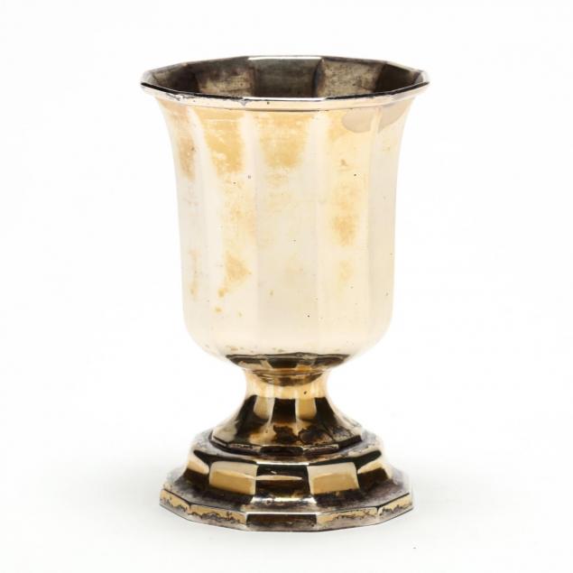 19th century, likely .800 silver, unidentified hallmarks, stepped foot, paneled sides, flared rim, no monogram or engraving.