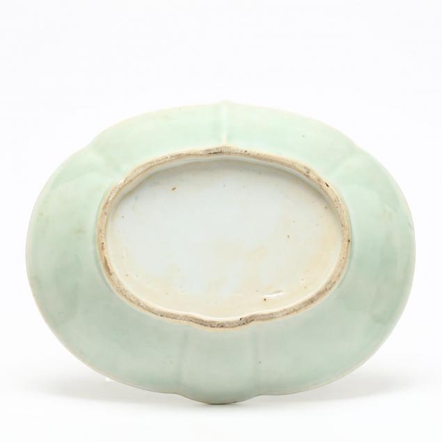 19th century, celadon glazed ground with polychrome enameled hand-painted decoration of flowers, butterflies, birds, and fruit in bright colors, gilded edges, includes two dessert size plates with blue mark to underside and one larger serving dish.