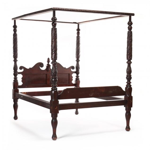 Fair condition; one rail with broken bolt to interior; no finials; later molding to tester; surface scratches and marring throughout; dryness to original finish.