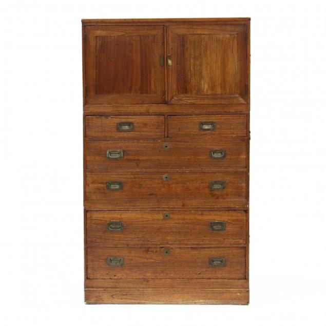 19th century, three part form, upper cabinet with hinged doors opening to reveal a drawered interior with paper lined doors, over six drawers, flush base.