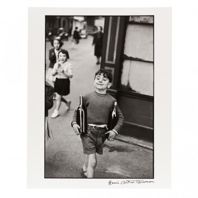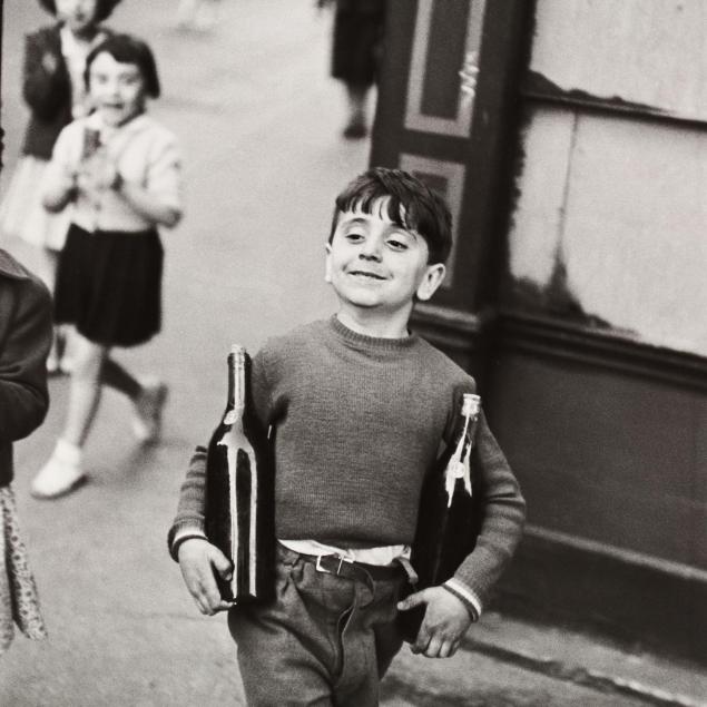 In this classic photo by Cartier-Bresson, a young boy strides proudly down Rue Mouffetard carrying two magnums of wine. This is the boy's first day on this grown-up errand for his family. Cartier-Bresson uses candid photography here to capture the boy's pride in his new responsibility as well as his playful and perhaps mischievous personality.