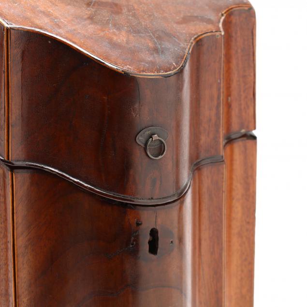 Circa 1800, mahogany, mahogany veneer, serpentine form, hinge lid with line inlays to edges, interior with divided and inlaid decoration.