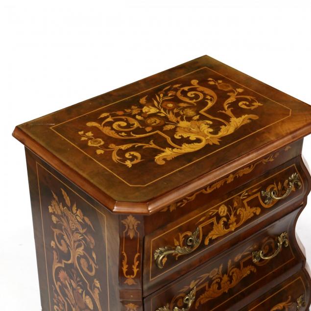Burl walnut veneer with light wood inlays, bombe form, top with molded edge and floral spray inlays, over three shaped drawers with repeating floral inlays which continue to the sides of the case, supported on carved paw feet.