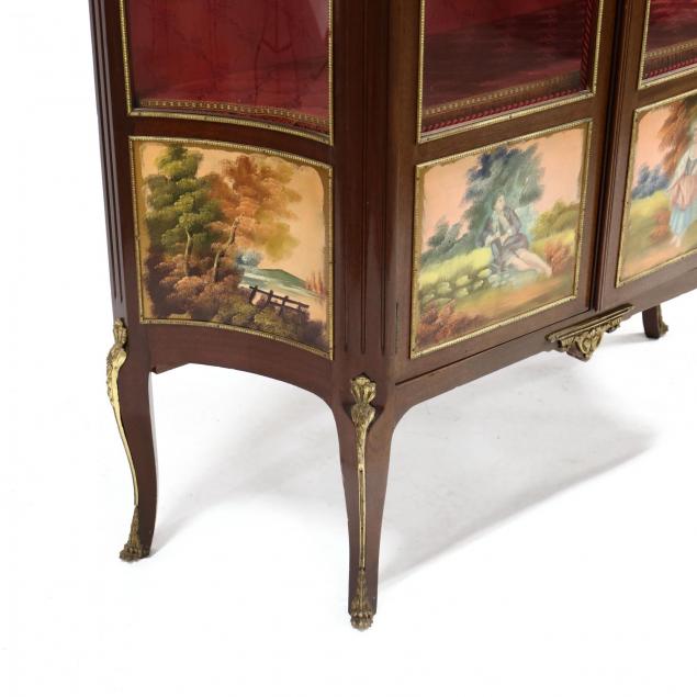 Mid 20th century, mahogany, shaped marble top, two hinged glazed doors with upholstered and shelved interior, case featuring ormolu mounts, with enhanced printed panels on cabriole legs.