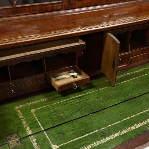 Circa 1800, two part form, mahogany, oak secondary, cove molded cornice, with vertical book matched veneer frieze, astragal molded doors, with louvered shelf interior, lower case with fold down butler's desk, over three cock beaded drawers, raised on French bracket feet with scalloped skirt.