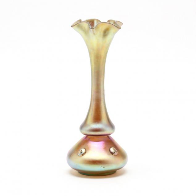 Early 20th century, blown glass in gold iridescent finish with bright pink to blue hues, tooled rim, with four applied prunts towards base, polished pontil, marked "Aurene 224."