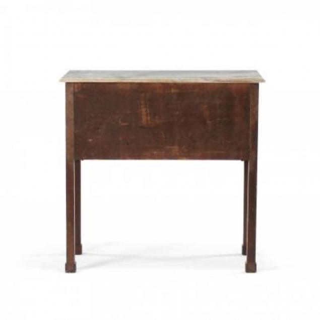 The Estate of William Lee Pritchard, M.D., Charlotte, NC Two drawers, each with a rear cut and repair to back board; lower left drawer with lip repair to upper edge; drawer runners rebuilt to left and right lower drawers and to the left side of the upper long drawer; applied knee frets likely later; cut and patch to top of right leg; white staining and wear to later marble top.