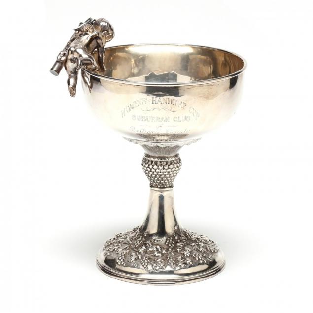 In the form of a bowl on tall pedestal base, the domed foot finely hand-chased with a grapevine motif against a stippled ground, the standard featuring a pineapple form knop supporting the deep bowl above upon which a fully modeled cherub with golf clubs perches on the rim to gaze at his reflection, one side engraved