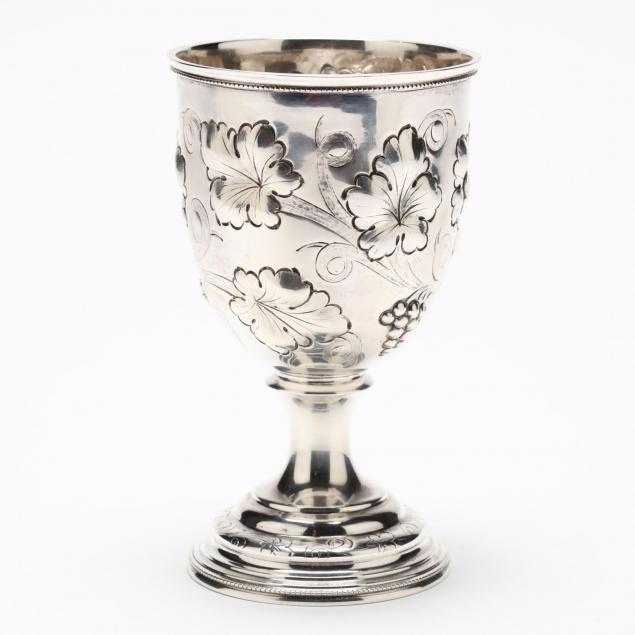 Unmarked, mid-19th century, the deep bowl with hand-chased grapevine motif, the central cartouche engraved "From / C. S. Selliger."