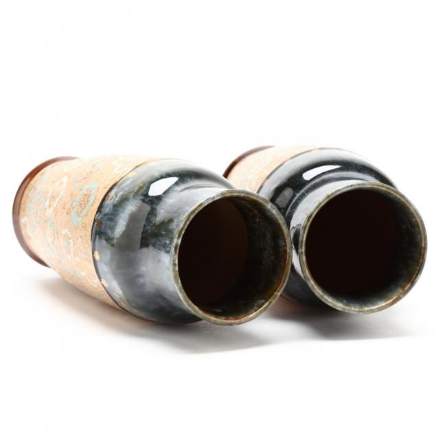 To include: an early 19th century stoneware pitcher decorated with a low relief hunt scene (chip to handle; small chip to relief grass; minute rim frit) (9.5 in.); and a pair of mid 20th century tapestry vases (10 1/8 in.).