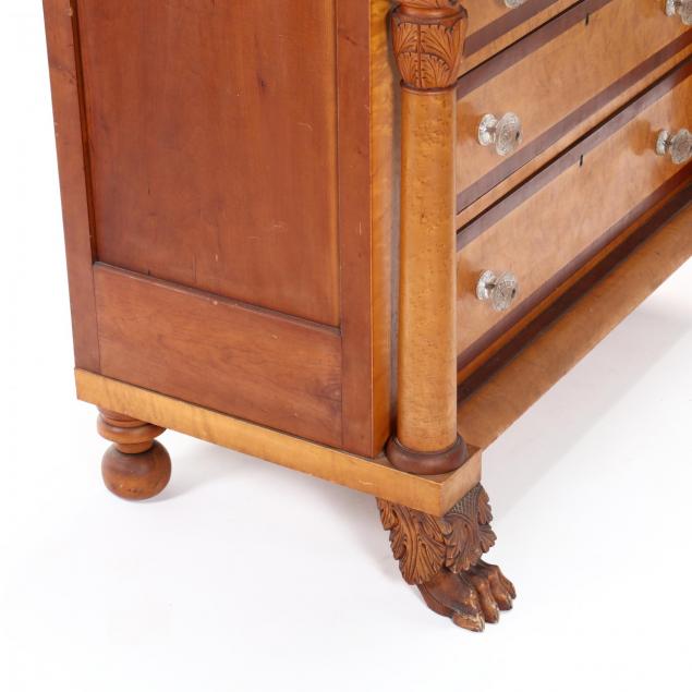 Circa 1830, cherry, with birdseye maple and mahogany veneers, yellow pine secondary, later black marble top, upper projecting paneled drawer over three graduated drawers, with sandwich glass pulls, flanked by fully turned columns with acanthus leaf capitals, with repeating acanthus leaf and paw feet, paneled sides, turned rear feet.