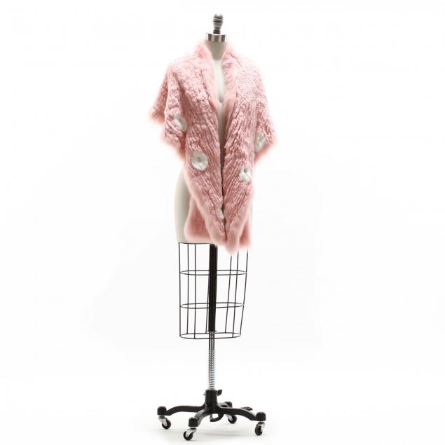 The first is light blue shawl with tail fringe, Sakowitz label (86 in.) and a pink stole with white fur eyelets, Bergama label, (LOA 80 x15 in.)