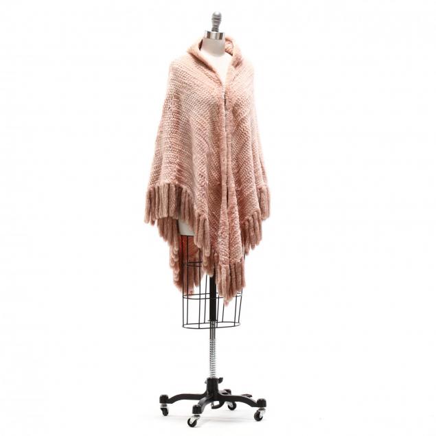 The first, a woven pink shawl with mink fur fringe (several pulls to the knit) (86 x 38 in. measured without fringe); the second is a brown jacket with ruffled front and bottom edges, sleeves that flare at the wrist, Bergama Fine Furs Label (shoulder to hem 21 in.; sleeve 21 in.) (no condition concerns). The synthetic fabric scarf features the iconic LV monogram (no condition concerns).