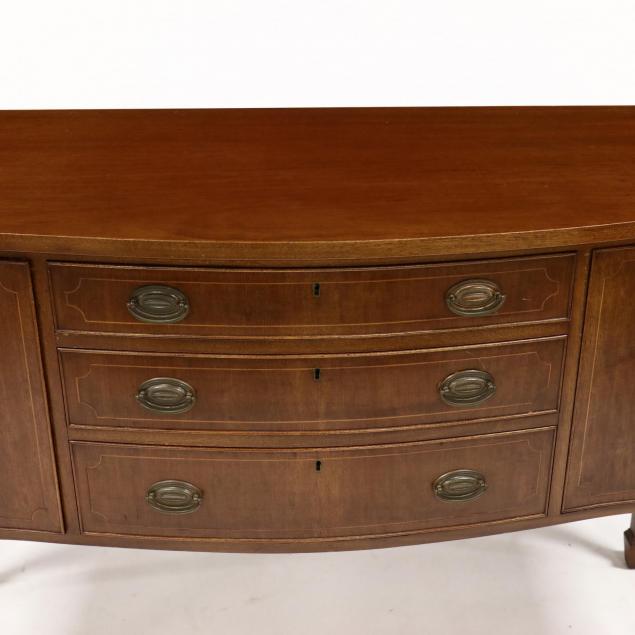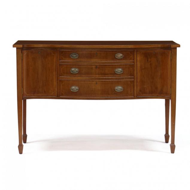 Mid 20th century, mahogany, light wood inlay, serpentine form, three graduated cock beaded drawers, flanked by bowed hinged doors, raised on square tapered legs with spade foot.