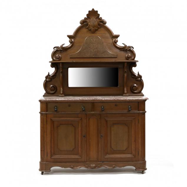 Late 19th century, walnut, burlwood veneer, rococo style carved and mirrored backsplash, rouge marble top, two drawers over two hinged panel doors, raised on casters.