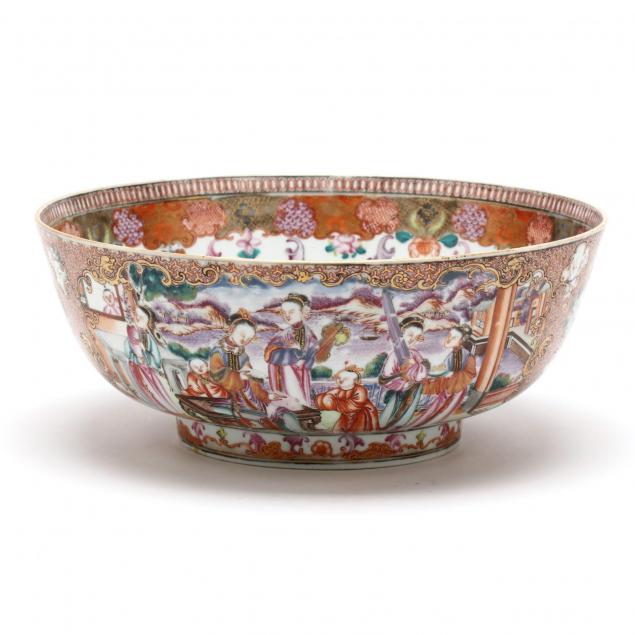Late 18th century, with highly decorated and finely painted interior and exterior, the exterior features landscape vignettes in reserves alternating with figural panels illustrating ceremonial pastimes, the interior features a wide diapered border with feathered plumes alternating with shells, moths, and flowers.