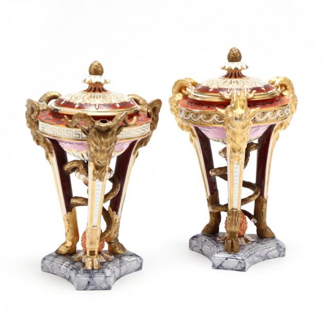 England, 1806-1825, the small urns, with reticulated covers, are supported by three columns topped by gilt ram masks and terminating hooves, the columns joined by a gilded serpent, each with iron red mark to the underside. The ram masks and the drop pendants differ between the two perfume burners.