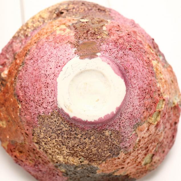 Hand formed pottery with air pocket glazes in light creams, pinks and metallic glazes, each with tooled rims and signed.