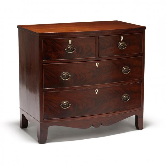 Circa 1800, nice diminutive size, mahogany veneers with oak and pine secondary woods, two over two drawers with cockbeaded edges, shaped skirt, raised on tall bracket feet, and with ivory escutcheons.