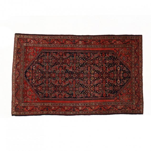 Deep blue field with all over stylized herati; main guard border with scrolling vine and floral motif.