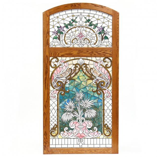 Late 20th century, three part form, oak frame, floral and scroll decoration with cut glass cabochons, slag glass and clear glass panels, tongue and groove joint.