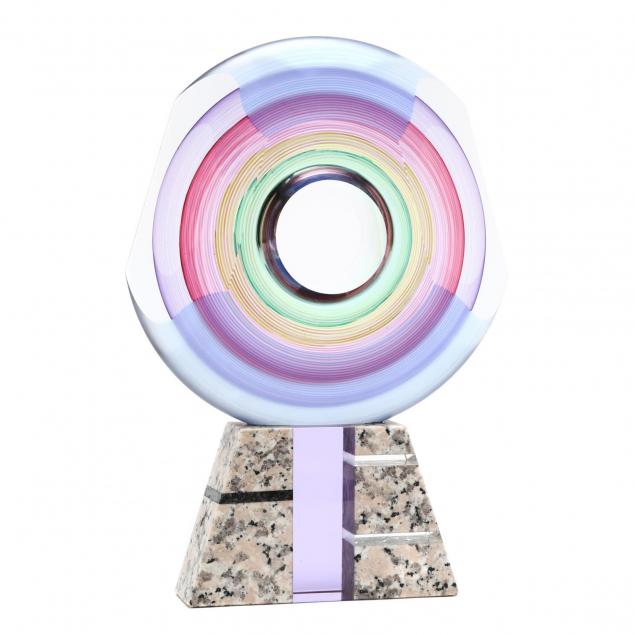 Late 20th century, layer multi color glass with open center, frosted, cut and polished outer edge, mounted on a polished granite and glass base, signed and numbered 108649.