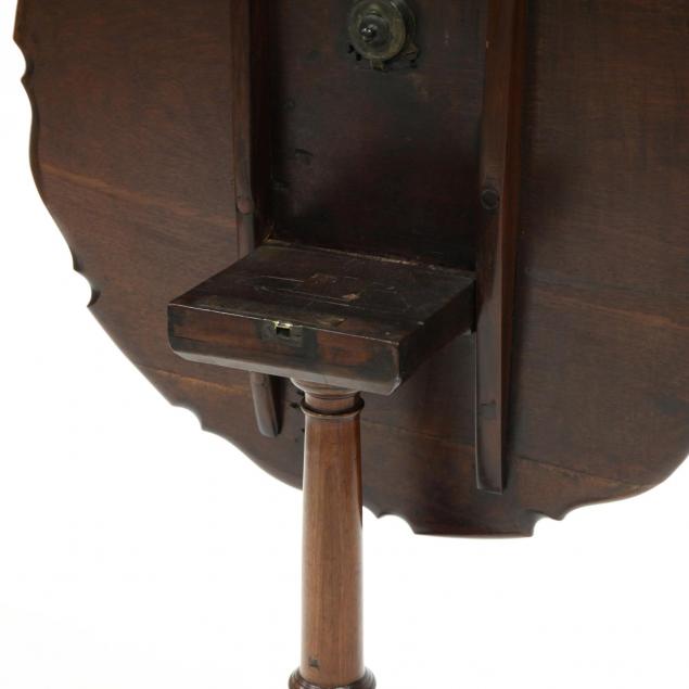 18th century, shaped pie crust hinged circular top, tapered shaft with turned urn, tripod base with relief carved knee and foot.