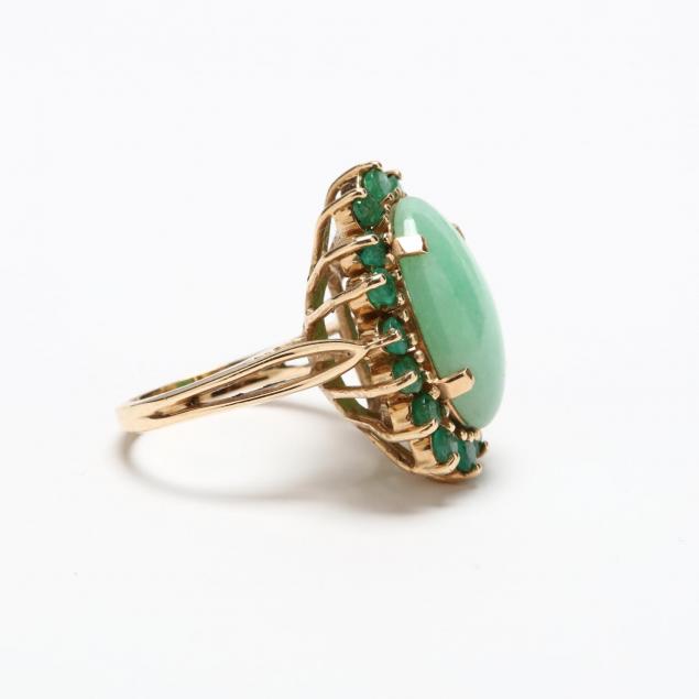 The oval shaped cabochon jadeite (18.08 x 11.90mm) prong set and with a conforming surround of ((16) prong set round brilliant cut emeralds weighing approximately .96 total carat, stamped 14KT.
