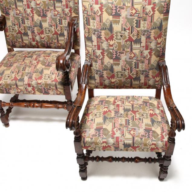 18th century, mahogany, over upholstered with later abstract tapestry upholstery, bold scrolled arms, turned standards, with spiral twist and turned stretchers, on ball feet.