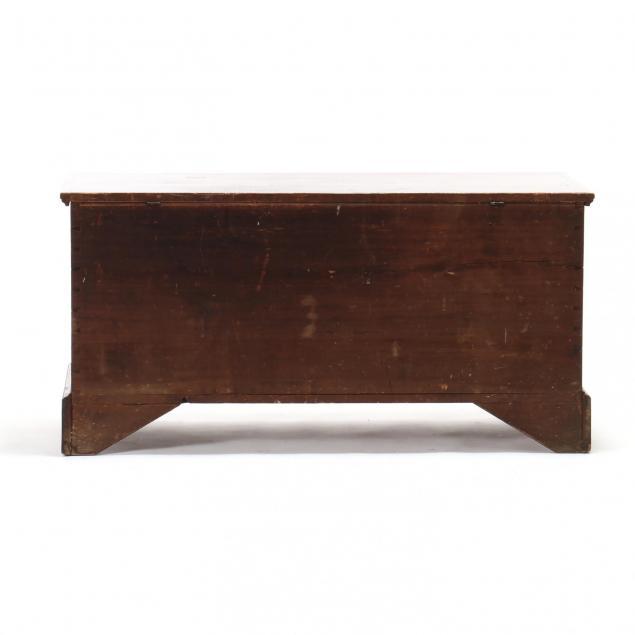 Attributed to the lower Shenandoah Valley of Virginia, early 19th century, poplar dovetailed case, with original red painted surface, hinged top with applied molded edge and original fishtail hinges, interior with till to the left side with a walnut lid above two dovetailed drawers, molded base, raised on shaped dovetailed bracket feet.