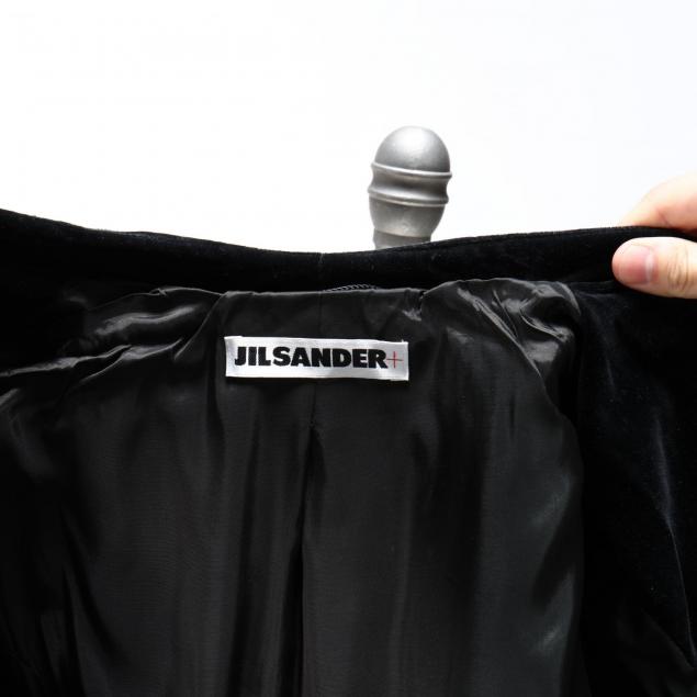 Jacket composed of black velvet with allover beading in a foliate design, Jill Sander label, asymmetrical hem, paired with a black silk pencil dress having spaghetti straps, rear zipper, labeled "Frank Composto."
