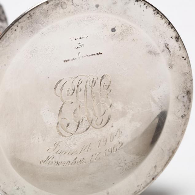 Mark of A. G. Schultz & Co., retailed by The Jas. R. Armiger Co. of Baltimore, MD; both engraved to the underside "EHV / June 14, 1904 / November 17, 1962," weighted base.