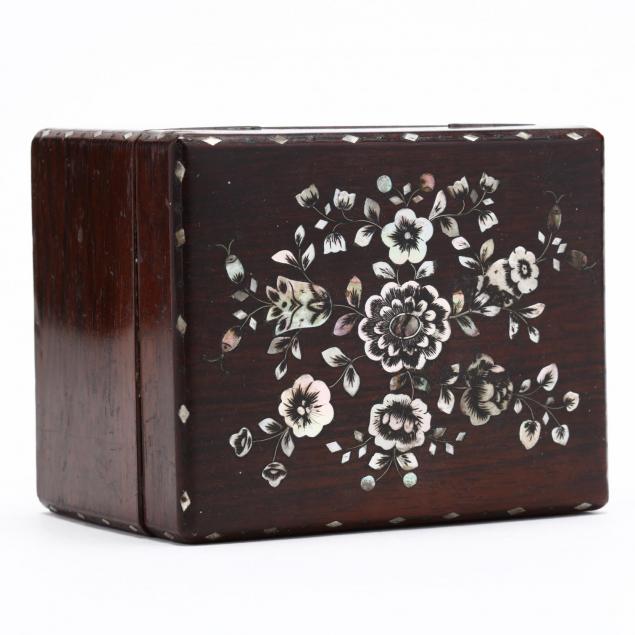 Early 19th century including a rectangular mahogany case with hinged lid, divided and lidded interior, flush molded base; and a rosewood box with mother of pearl floral spray inlay, glass and ivory lined interior.