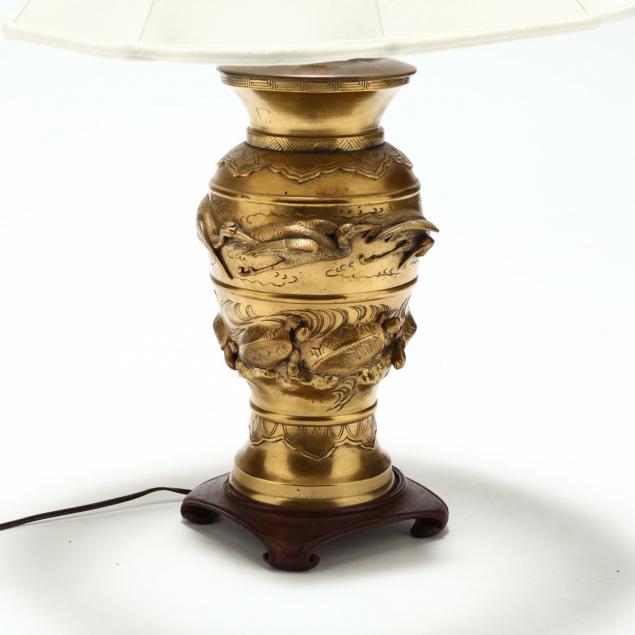 Circa 1900 gilt brass vase having relief decoration of cranes and turtles, mounted on a wood stand, with a paneled shade.