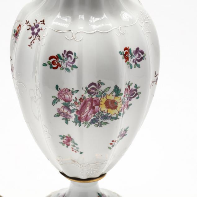 Possibly Samson, hand painted crest and floral design with gilt highlights, raised on a brass base.