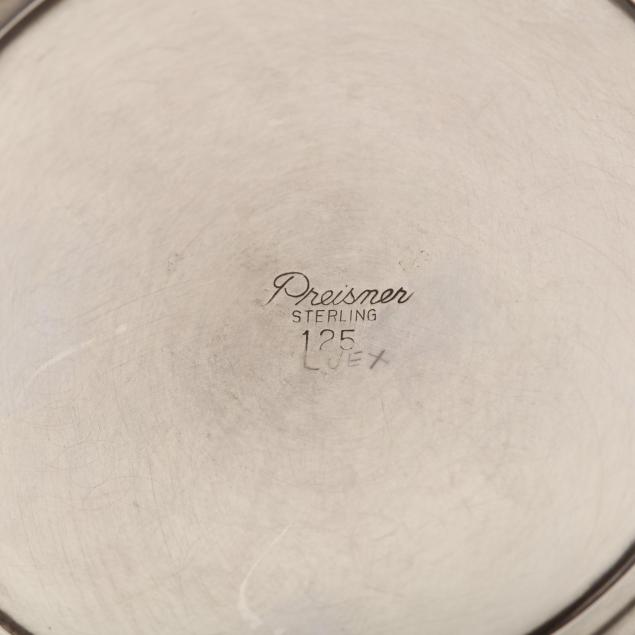 The water pitcher with mark of Preisner, pattern number 125 (9.25 in.); the butter dish with mark of S. Kirk & Son Inc., pattern number 4104, with removable decorative pierced tray (6.25 in. diameter); the soup ladle also with mark of S. Kirk & Son (14.5 in.); all three with period "W" monogram.
